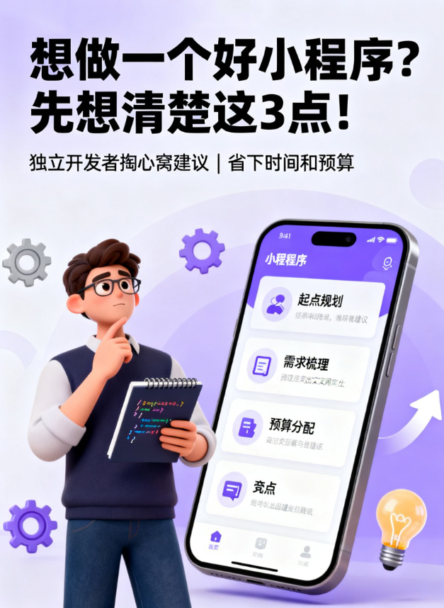作为一个开发者,不只写代码,更帮客户把想法落地。 见过太多项目卡在起点,其实问题不在技术,而在开始之前。 如果你正想开发小程序,请先花3分钟看完。这能帮你省下不少时间和预算。 1. 别急着问“多少钱”,先想清楚“为什么做”? 很多客户一来就问:“做个小程序多少钱?” 这就像问“装修一套房多少钱?”——答案完全取决于你的需求。 我会建议你先思考: 核心目标是什么? 是卖货、品牌展示、还是服务预约? 为目标用户解决什么痛点? 是帮他们省时间、省钱,还是提供便利? 你希望用户进来后做什么? 是立刻下单、预约服务,还是留下信息? 想清这些,我才能帮你判断:功能要不要那么复杂?预算该花在刀刃上的哪里?一个清晰的目标,是成功的一半。 2. “模板”虽便宜,但“定制”才是真正的性价比 我理解很多初创客户预算有限,想用“模板”省钱。 但作为开发者,我必须坦白:模板的坑,后期填不平。 你想改个流程? —— “对不起,模板固定,改不了。” 你想加个功能? —— “要动底层架构,不如重做。” 用户量上来变卡了? —— “这是模板性能瓶颈,优化不了。” 而我为你定制开发: 代码100%属于你,后期你想加功能、做迭代,我随时能帮你。 架构干净合理,为你的业务未来增长留好空间。 体验为你量身打造,每一个按钮的位置都经过思考。 长远看,定制开发的风险更低,灵活性更高,才是真正的省钱。 3. 别把我当“外包”,请把我当成你的“技术合伙人” 我不是一个冰冷的执行机器。你买的也不只是我的编码时间,更是我多年的经验和思考。 在合作中,我常会做这些“额外”的事: 帮你“砍需求”:有些功能华而不实,我会劝你放到2.0版本,先确保核心体验。 提出“更好方案”:用更简单、更低成本的技术路径,实现同样的业务目标。 预警“潜在风险”:从审核规则到性能瓶颈,提前帮你避开我踩过的坑。
